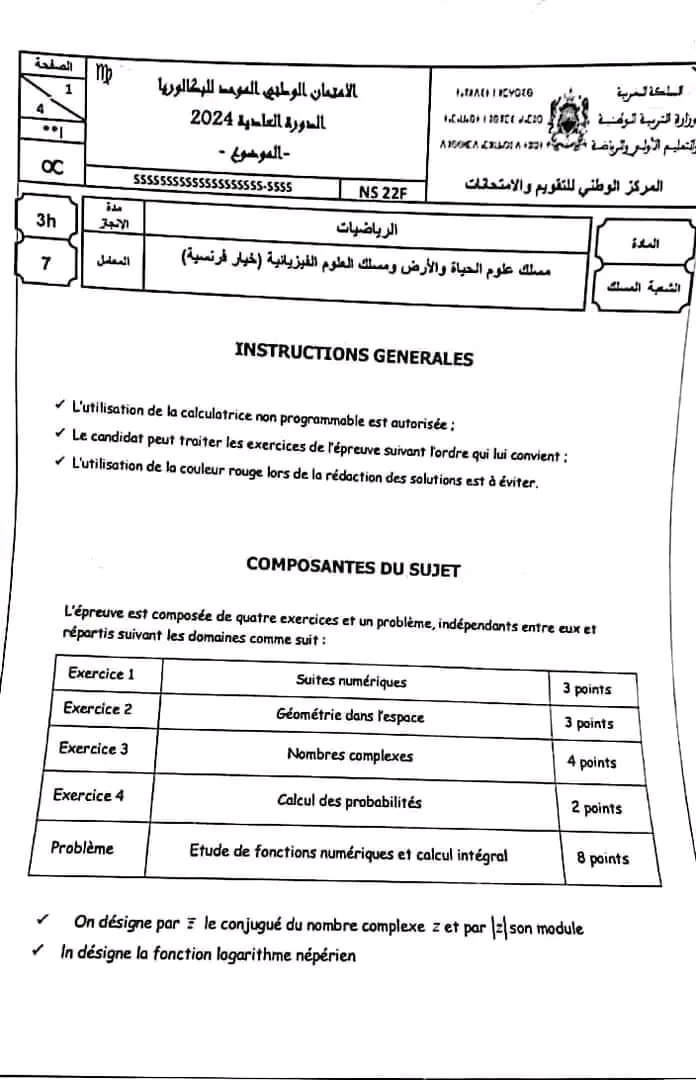 امتحان البكالوريا 2024 لمادة الرياضيات الدورة العادية مسلك علوم الحياة والارض ومسلك العلوم الفيزيائية (خيار فرنسية) مع التصحيح